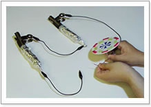 | 模型用のモーターをつなぐと、勢いよく回ります。アルミホイルを巻いた備長炭を強く握ると、接触がよくなりさらにパワーアップします。 | ||