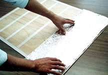 | シワシワになったアルミホイルをよく延ばし、両面テープにあてがって貼りつけていく。シワをつけた分、ホイルの幅は25mmより若干短くなっているので、板の端は5mm位あけておく。1列貼ったら、次のアルミホイルを隙間をあけないようにぴったりくっつけて貼っていく。 | ![]() |