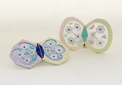 一見すると、ちょうちょのようなブローチは、コンパクトを開いた瞬間をイメージしてデザインしたものです。 コンパクトを開くときのトキメキをキラキラ光るアルミ箔の花で表現しています。一つ一つアルミ箔を手でカットしているので全てが違う形です。アルミ箔を透け感のあるシルクオーガンジーで挟み、その上に刺繍を施しているので、平面でありながら奥行きのあるアクセサリーに。