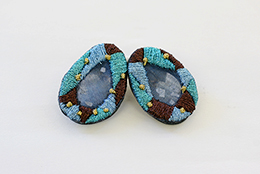 作品が刺繍のアクセサリーなので糸と布がメインですが、アルミ箔を入れることにより糸と布の柔らかさが際立ち、逆を言えば糸と布にアルミ箔が入るとアルミ箔の強さ、きらめきが際立ちます。アルミ箔を使う場合は、お互いの対比の美しさを出したいと考えてデザインしているそうです。