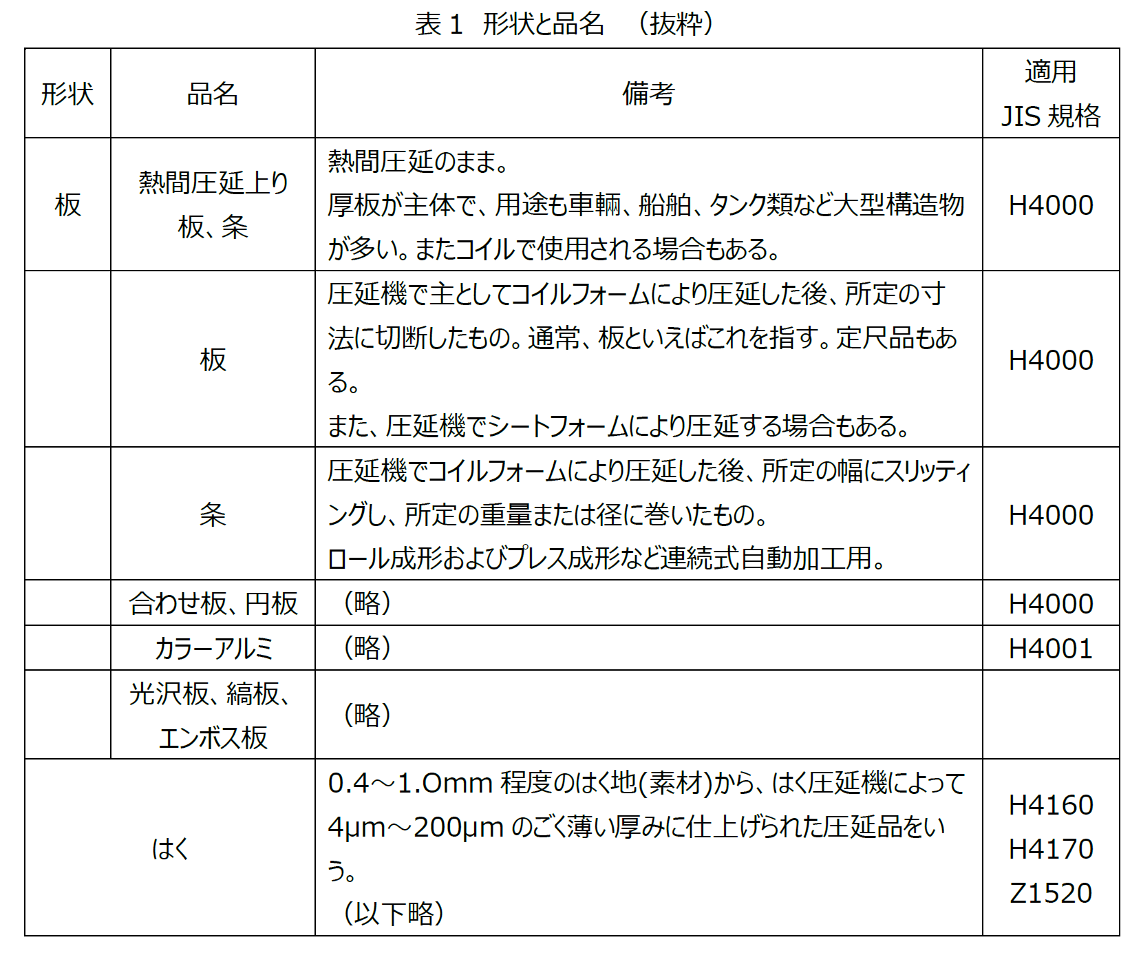 アルミニウムおよびアルミニウム合金の製品は他の金属の場合と同様に、板、形材、管、棒、線および鍛造品などの形状に区分され、さらに形状は製造方法によっていくつかの品名に分けられます。同じ合金・質別であっても、形状や品名が異なると、強度や寸法精度に差を生じたり、材料としての使用目的が異なることもあるため注意を必要とします。